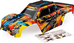 Traxxas karoséria X-Maxx Solar Flare - nafarbená s aplikovanými nálepkami, vrátane rámu a ochranných prvkov.