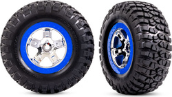 Kompletné predné kolesá pre 2WD autá Traxxas Slash. Chrómované disky s modrými ráfikmi a nalepenými pneumatikami BFGoodrich® s vložkou.