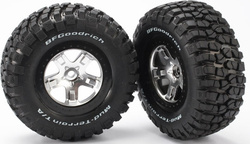 Kompletné zadné kolesá pre 2WD, predné aj zadné kolesá pre 4WD autá Traxxas Slash. Strieborné disky s čiernymi ráfikmi nalepenými pneumatikami BFGoodrich® KM2 a vložkou.