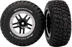 Kompletné zadné kolesá pre 2WD, predné aj zadné kolesá pre 4WD RC autá Traxxas Slash. Disky Split Spoke čierne so striebornými ráfikmi, nalepené pneumatiky Goodrich KM2 Mud Terrain.