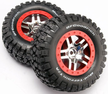 Kompletné zadné kolesá pre 2WD, predné aj zadné pre 4WD RC autá Traxxas. Strieborný disk Split Spoke s červenými ráfikmi s pneumatikami BFGoodrich KM2 Mud Terrain a vložkou.