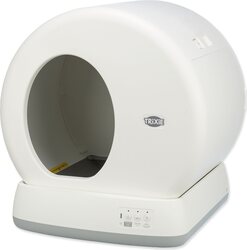 Automatická toaleta Trixie v bielej farbe, vybavená systémom, ktorý po každom použití otáča bubon a oddeľuje nečistoty od čistého podstielky. Vďaka tomu je toaleta neustále čistá a pripravená na ďalšie použitie.