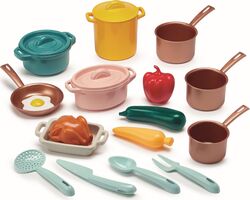 Veľká sada riadu, potravín a hotových pokrmov. Škatuľa zároveň slúži ako sporák.