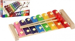 Krásne farebný detský xylofón vyrobený z kombinácie dreva a kovových rôzne veľkých dosiek, vďaka ktorým sa dieťa učí jednotlivé tóny a učí sa hrať jednoduché melódie skladieb pomocou dvoch paličiek.